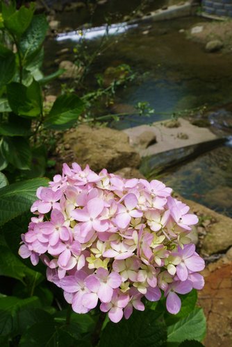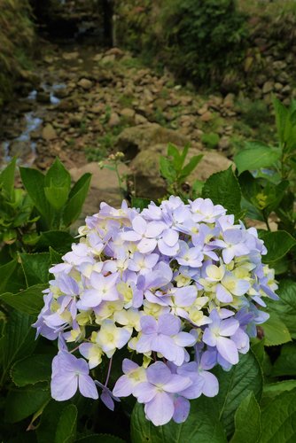 杉林溪的繡球花沿著滿山的步道.溪水邊與藥花園盛開