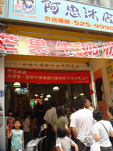 於是我們到了城隍廟旁的阿忠冰店,記得當初阿忠冰店還在巷子裡時我們光顧過幾次,外地來的我們只知道這家冰店生意很好,外觀看似不起眼,但冰品料好實在且便宜,所以每次經過小康媽和小康就會忍不住吃上一盤,後來他搬家到新點擴大營業後我就沒機會再吃了.......因為門口總是排了一堆人.......小康爸不愛吃冰又不耐等......所以就...無緣